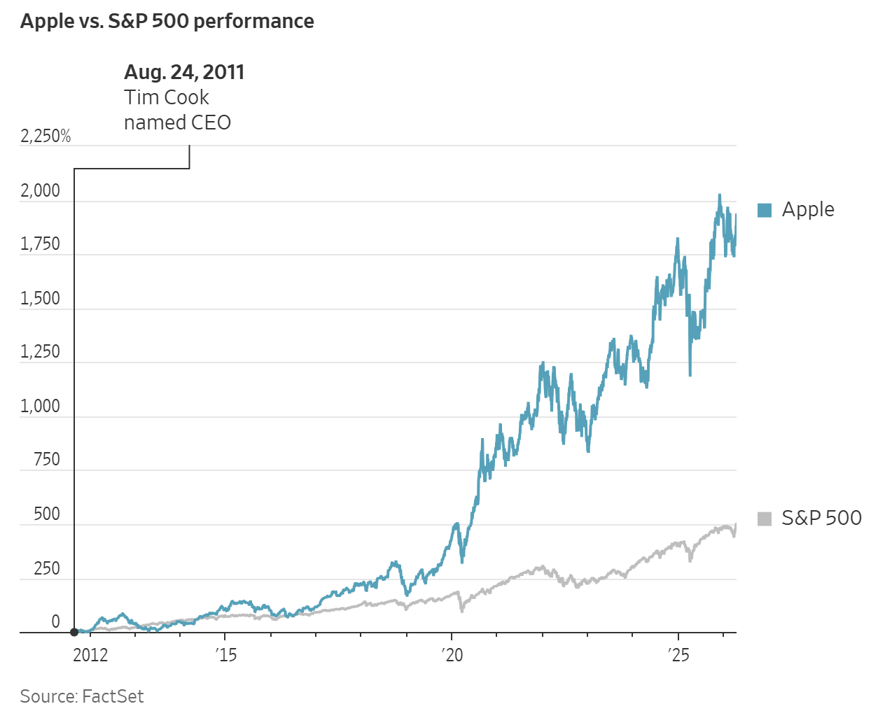 Cook leaves a legacy of extraordinary value creation, as he skillfully navigated Apple through significant geopolitical and economic challenges, including the imposition of tariffs by US President Trump and the disruptions caused by the COVID-19 pandemic. Under his leadership, Apple’s market capitalisation increased by nearly $3.7 trillion, reaching approximately $4 trillion, an achievement surpassed only by Nvidia’s Jensen Huang in terms of total value created by an American CEO.