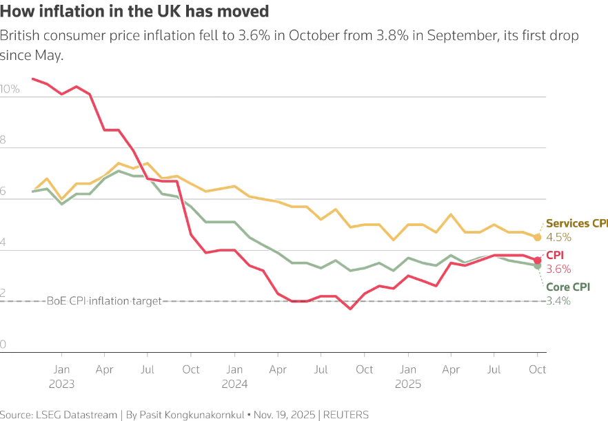 In the UK, official data revealed that consumer price inflation eased to 3.6% in October, down from September’s joint 18-month high of 3.8%, in line with BoE expectations. This moderation in inflation reinforced market expectations of a BoE rate cut in December.